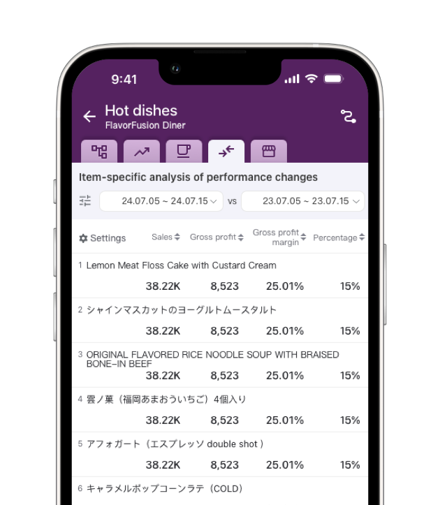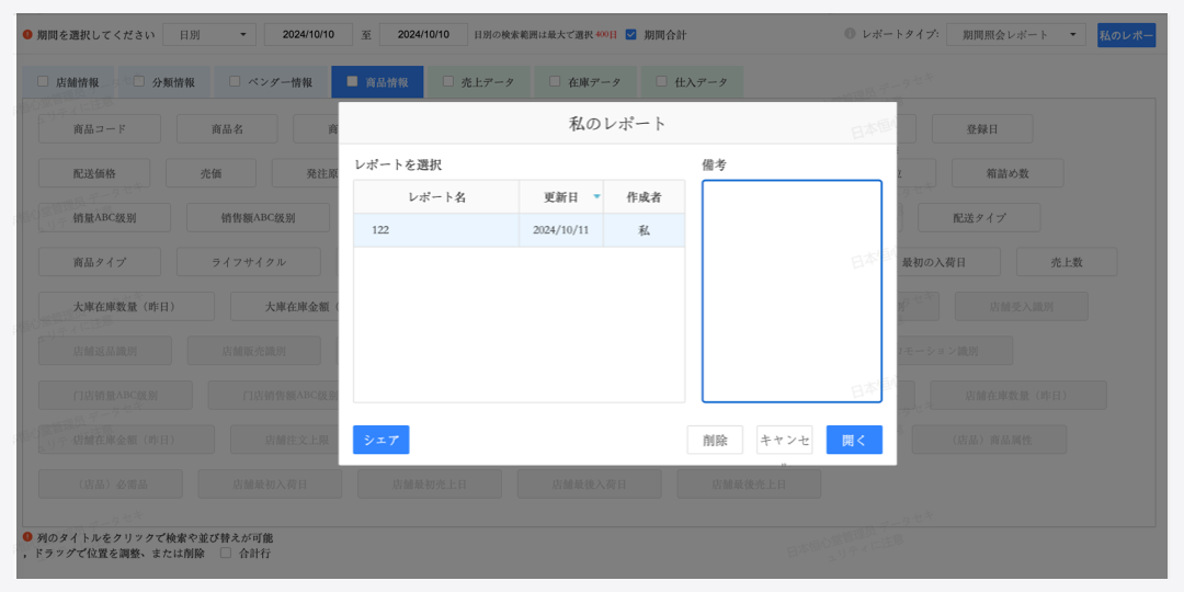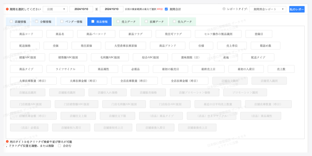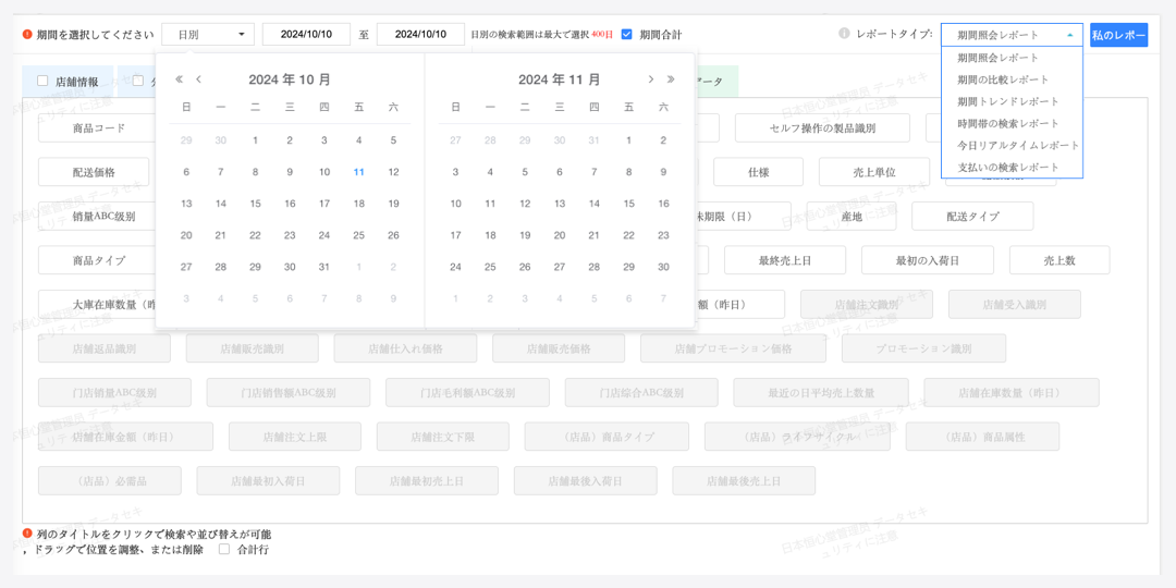 期間検索、期間比較、店舗比較、時間帯検査、トレンド検索など様々なよく利用するレイアウトで出力できる